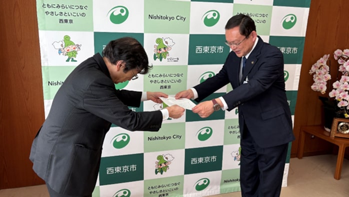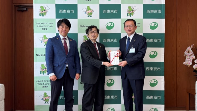 西東京市役所にて「トイレカー導入クラウドファンディング」への支援として、東京田無ライオンズクラブより10万円の寄付金を贈呈いたしました。